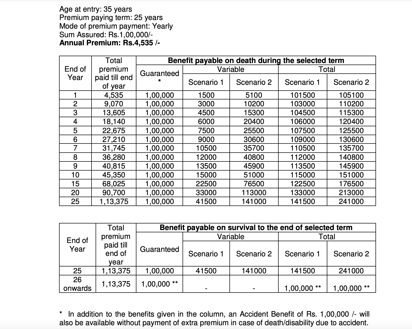 The Sum Assured along with the vested bonuses is payable in a lump sum on survival to the end of the term. An additional Sum Assured is payable on death thereafter.